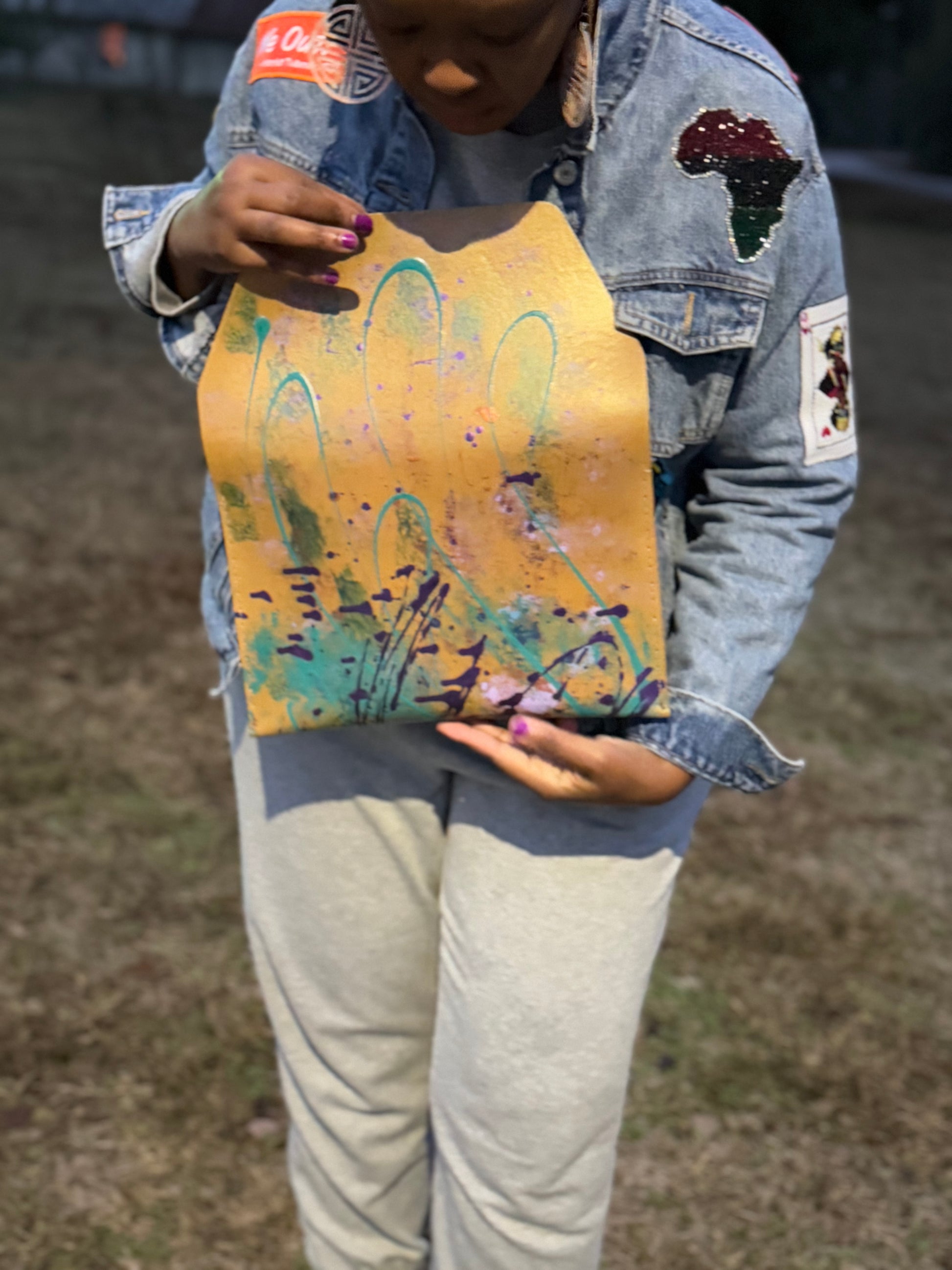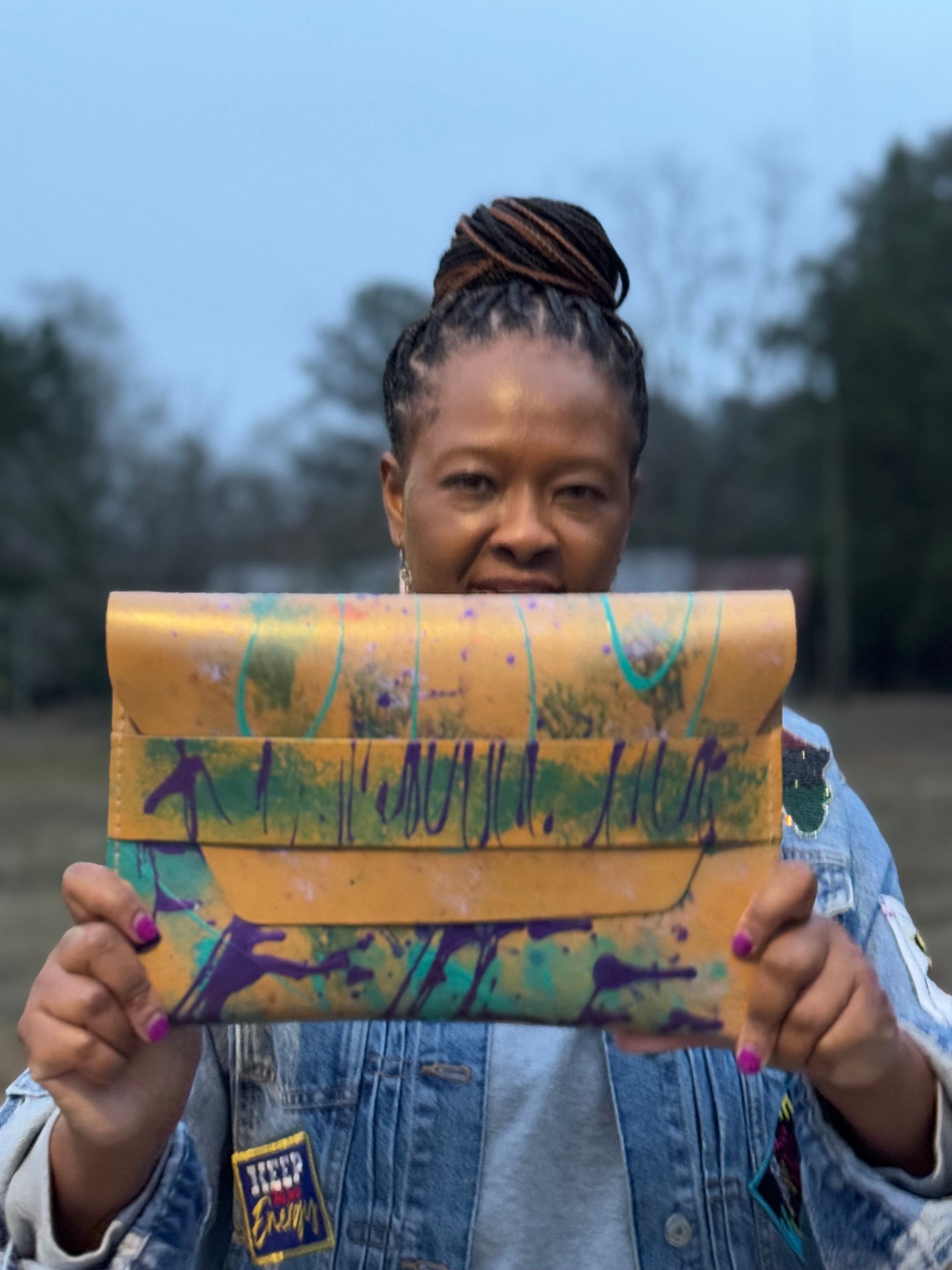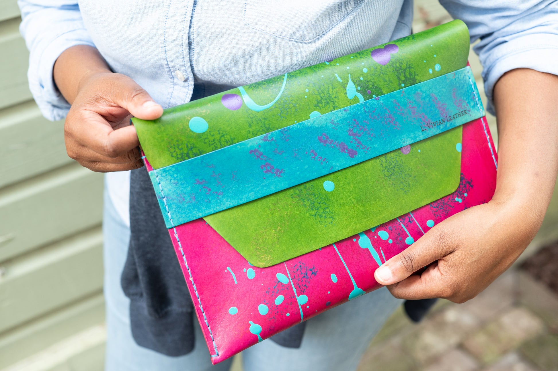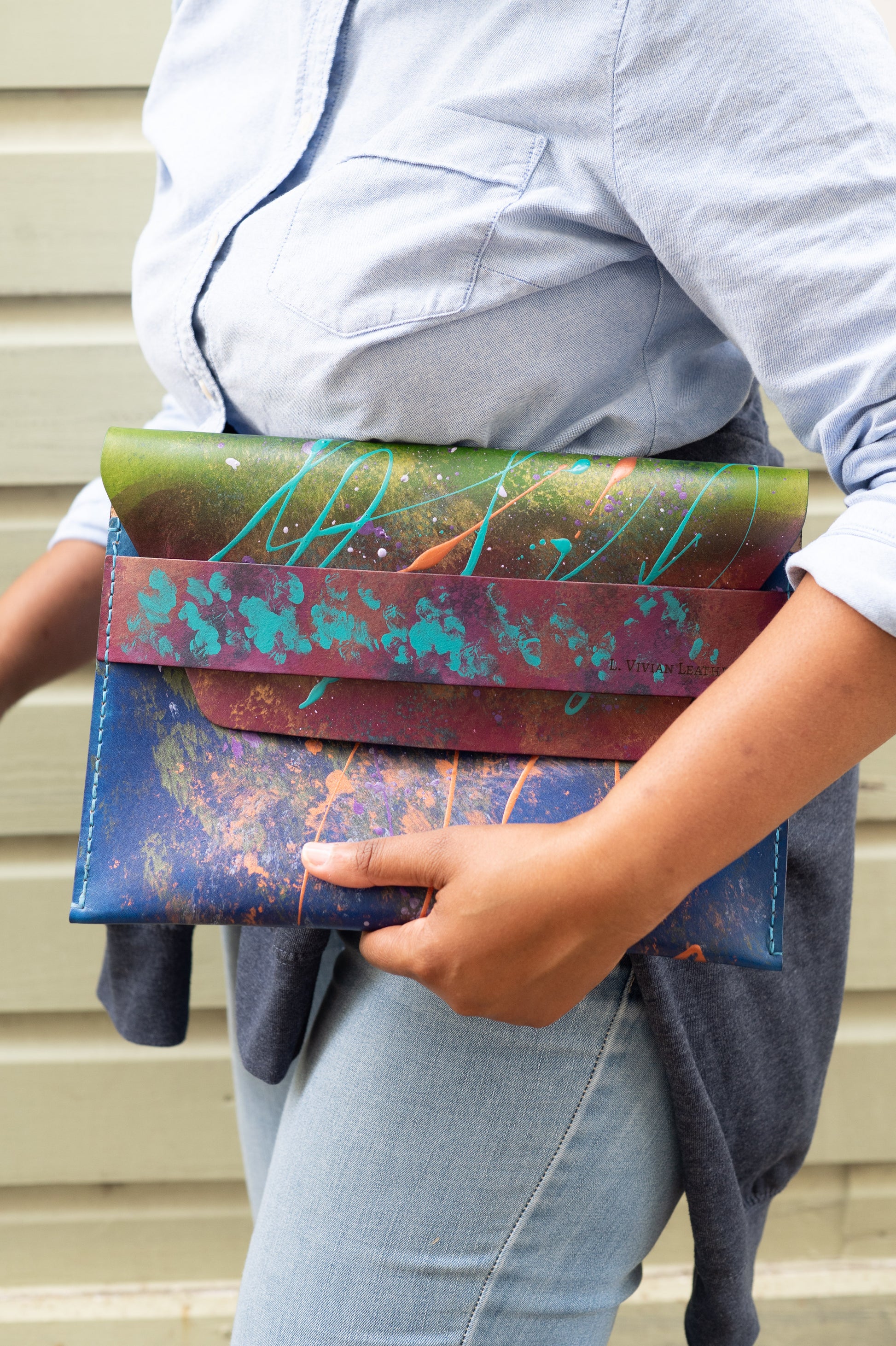Cartera de mano de piel Mae: un accesorio espectacular y versátil Realza tu look con esta cartera de mano de piel. Este precioso accesorio está elaborado con piel lisa con patrones artísticos, primaverales o teñidos a mano. Es perfecto para cualquier ocasión, ya sea que asistas a una fiesta, una boda o una salida informal. Esta cartera de mano te convertirá en el centro de atención con su diseño único y elegante. También cuenta con un interior grande para mantener tus pertenencias seguras y organizadas. Esta cartera de mano no solo es atractiva, sino también resistente y funcional. • Dimensiones: 20,32 x 33,02 x 0,32 cm (8 x 13 x 0,13 pulgadas) • Nota: El color de la piel puede transferirse a otras partes de la tela.